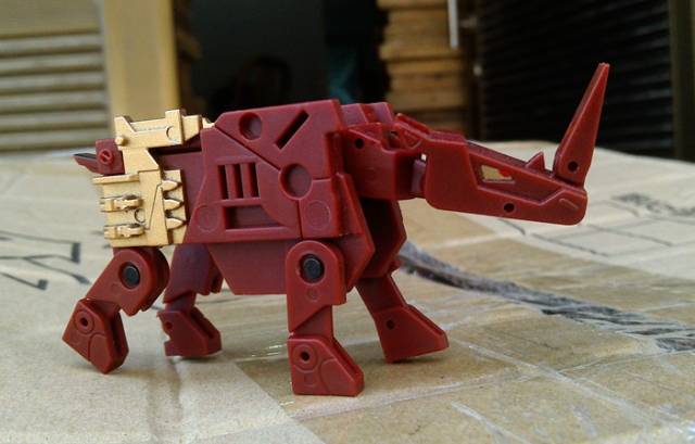 CST-01J Rhinohorn of Justice by KFC Toys is a Masterpiece Scale scaled 3rd party figure that transforms from a Cassette Tape to robot and back. CST-01J Rhinohorn of Justice is part of KFC Toys Cassette line which features popular figures that transform from robot or beast into a cassette tape. These tapes are Masterpiece scaled and can fit in the tape deck of Transformers Masterpiece MP-13 Soundwave, as well as KFC's own EAVI Metal series of Transistor figures.