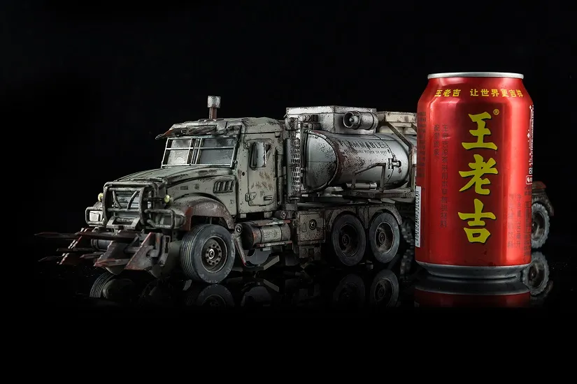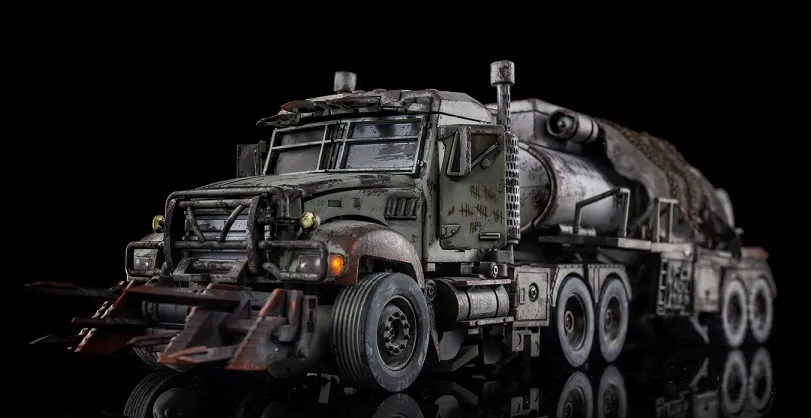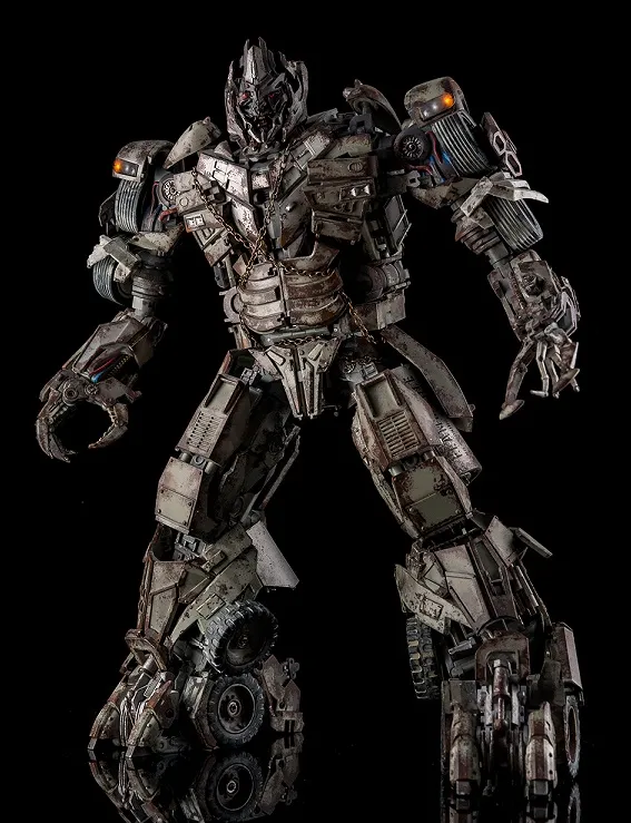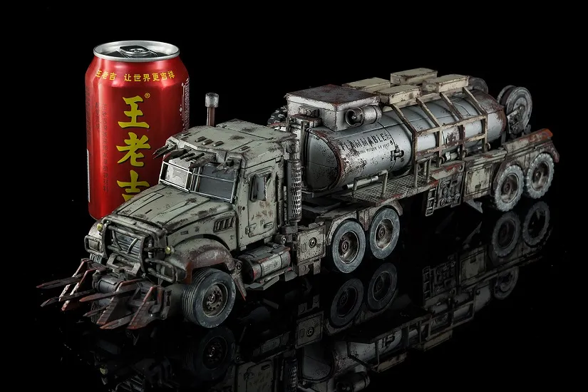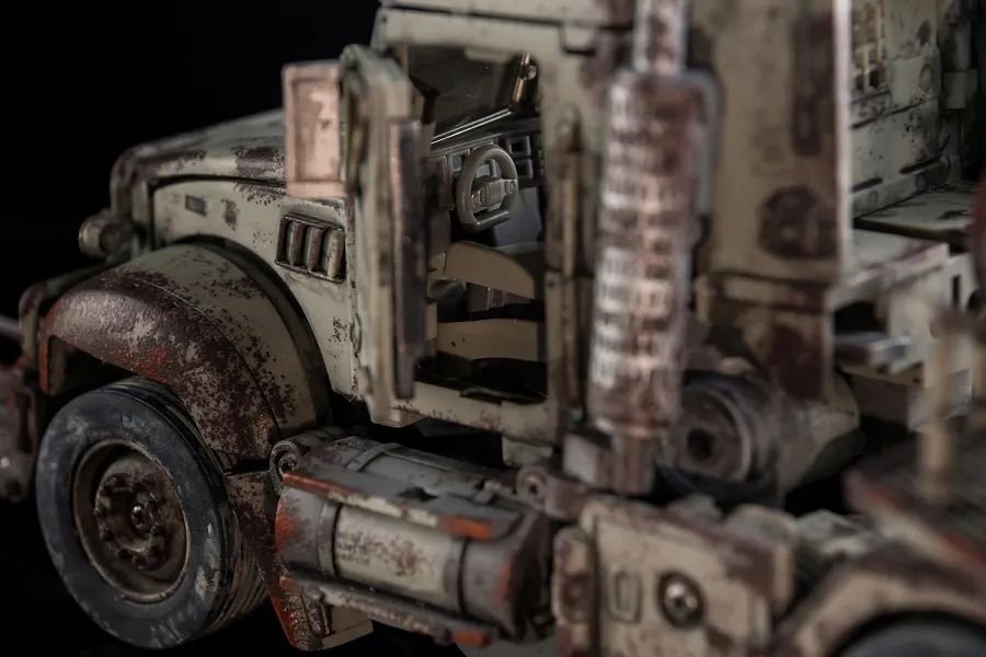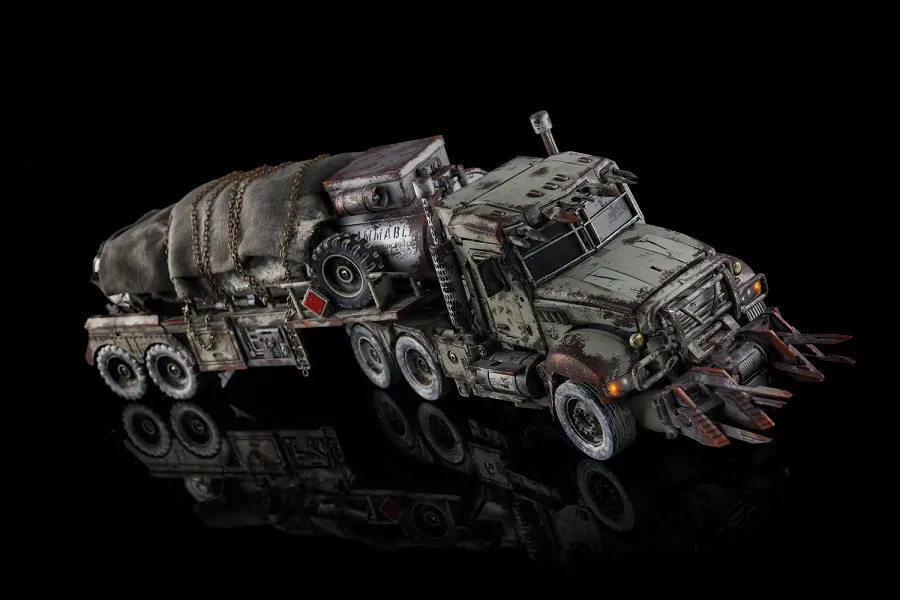 A-01 Mackron The King of Savannah from Alien Attack Toys stands approximately 12.6"/32.0CM tall in robot mode and transforms into a weathered semi truck with trailer! Mackron comes 1 shotgun, 1 Igor articulated figure (first run only), weapons, and features die-cast parts, matte and damaged paint apps, and ratchet joints!