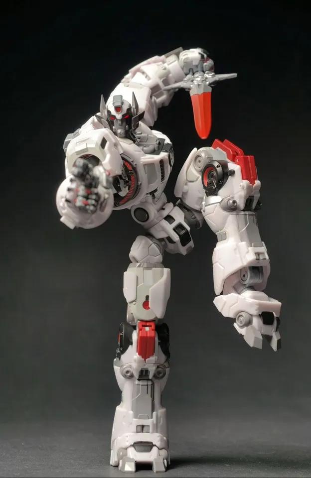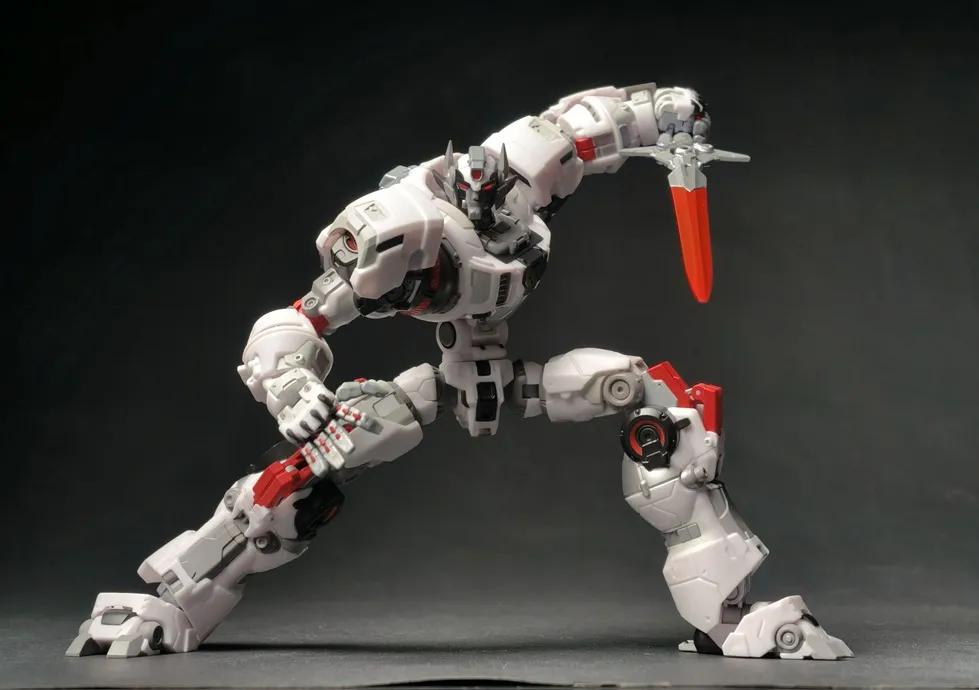 The signature sculpt features segmented armored plating and muscled transitions. The layered paintwork across the entire body helps to highlight the mechanical depth and surface realism of the figure. LED light-up eyes can be triggered by a hidden magnetic switch embedded in the sword hilt. The figure also includes functional hydraulic details that shift and reveal with movement at the elbows and knees. With more than 50 points of articulation, including fully poseable fingers, the figure can strike anything from an authoritative stance to an explosive combat pose.