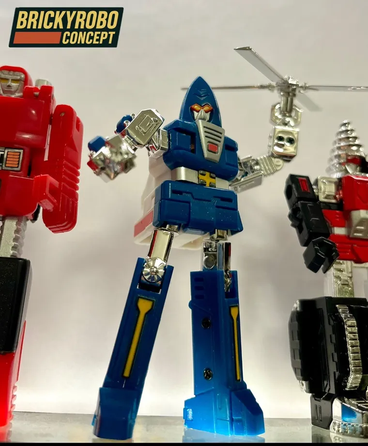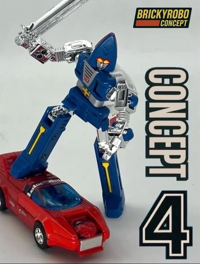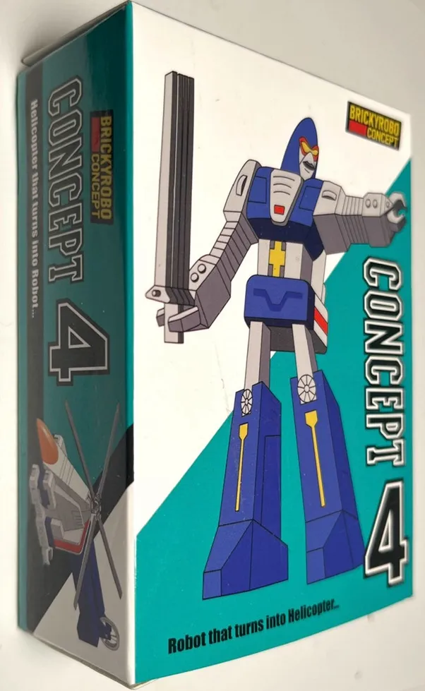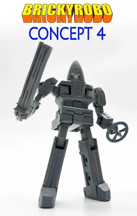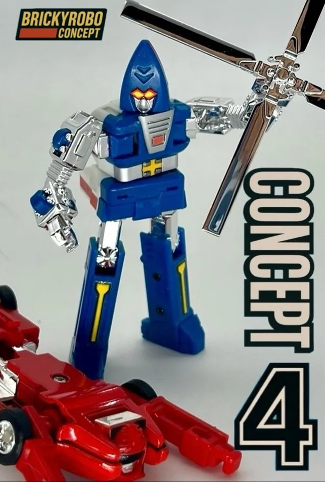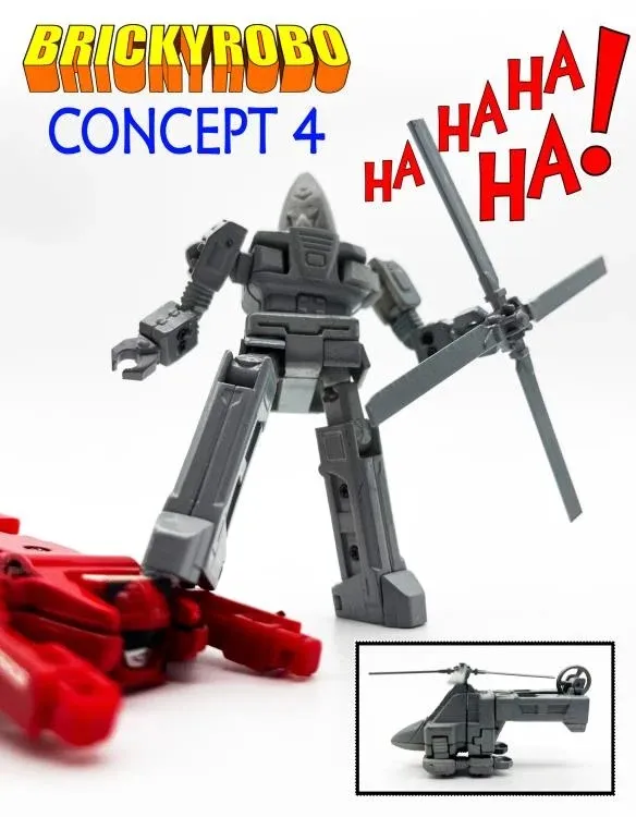 The BrickyRobo Concept 4 figure features cartoon-accurate details with over 30 articulations. This figure stands just over 3 inches tall in robot mode with a perfect body ratio. Concept 4 transforms from robot to helicopter mode. Order now to receive the cartoon-accurate rotor blade sword as a bonus!