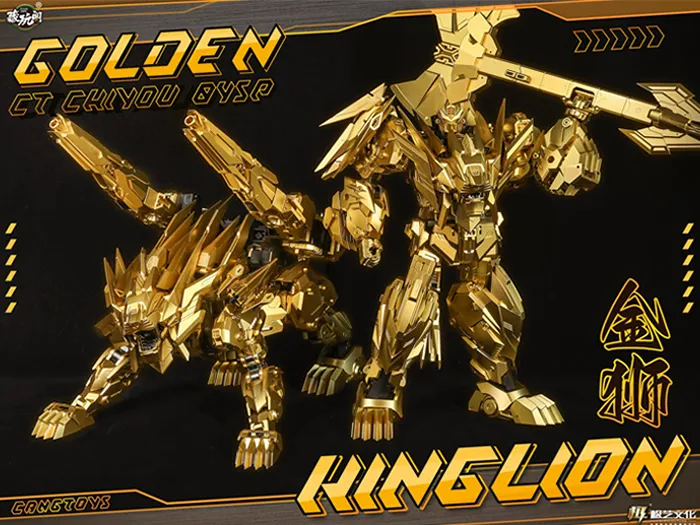 Celebrate Chinese New Year with a golden variant of CT-Chiyou-04 Kinglion and Dasirius! Kinglion converts from a robot to a lion, while Dasirius converts from a robot to a wolf. The set also comes with 2 cannons, an axe, and several other accessories.