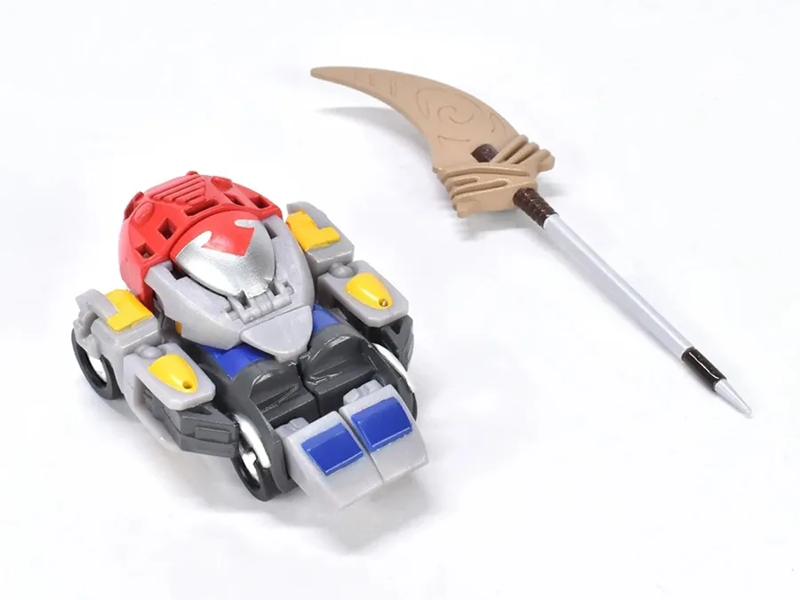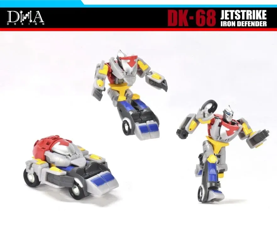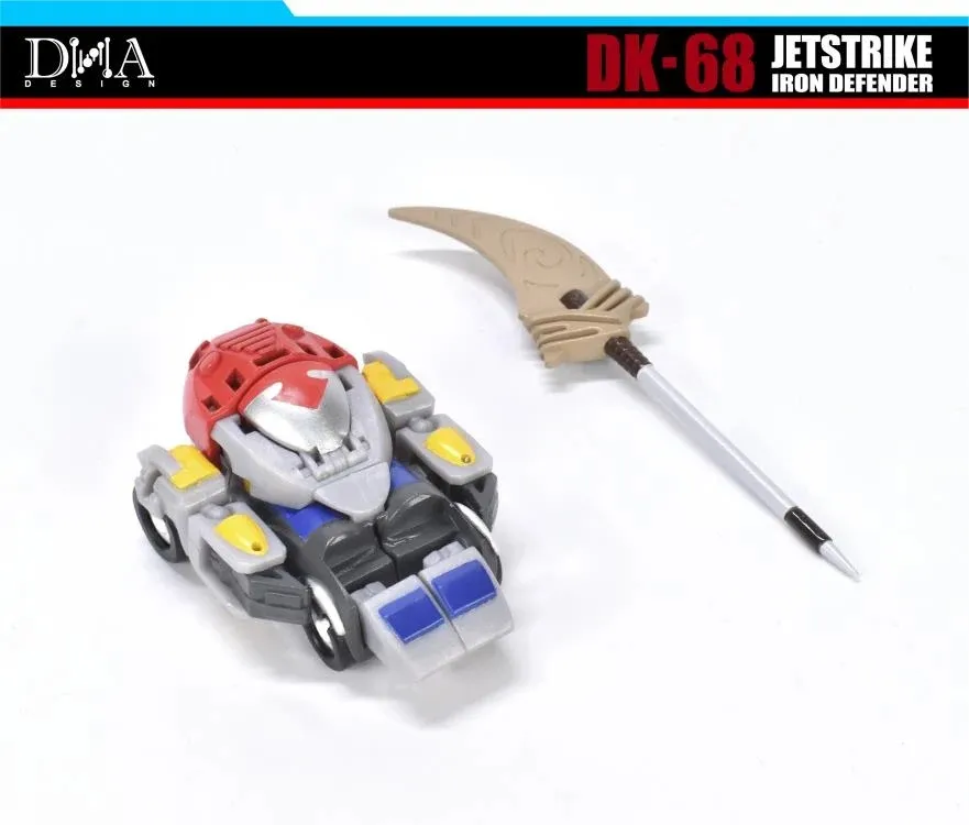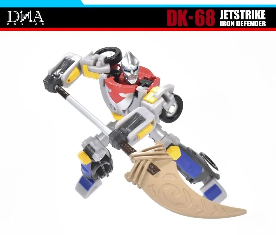The DK-68 Jetstrike Iron Defender features a new head sculpt and a new paint scheme for upgraded visuals and texture. The figure is fully transformable between robot and vehicle mode and is equipped with a battle spear!