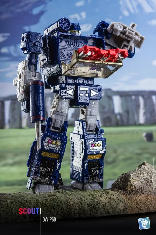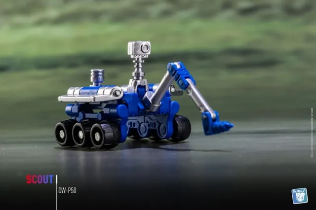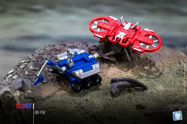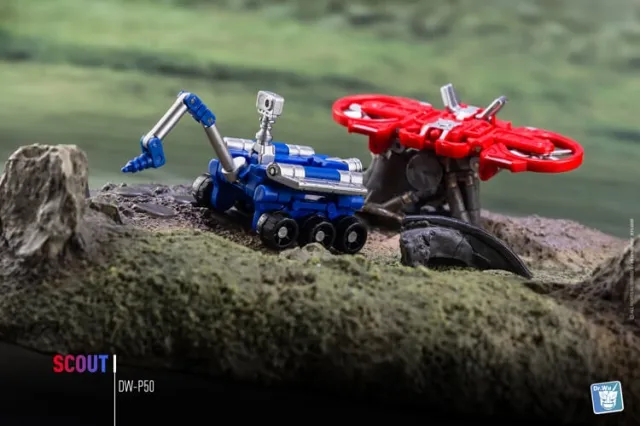 DR. Wu - DW-P50 Scout - Add on Parts includes 2 cassettes that trasnforms from vehicles to tapes and back. 1 tape transforms to a moon-rover, and the other tapes transforms to a drone. Both cassettes can fit in the tape-deck of Siege War for Cybertron Voyager Class Soundwave.