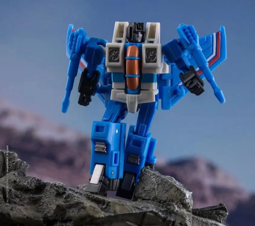 The E12 Blue Thunder figure stands about 3 inches tall in robot mode and can transform into a fighter jet.