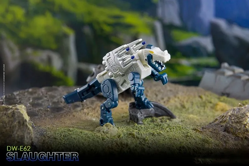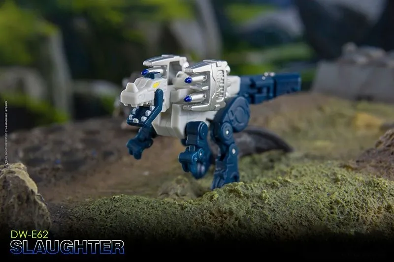 The DW-E62 Slaughter figure stands over 2 inches tall in dinosaur mode and can transform into a cassette tape alt mode.