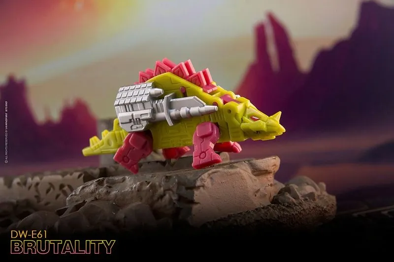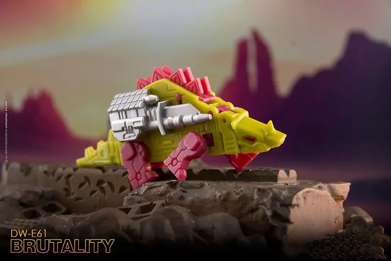 The DW-E61 Brutality figure stands over 2 inches tall in dinosaur mode and can transform into a cassette tape alt mode.
