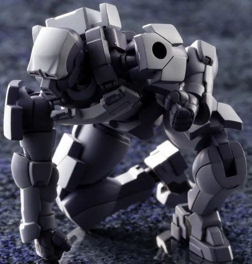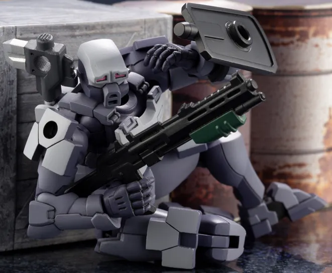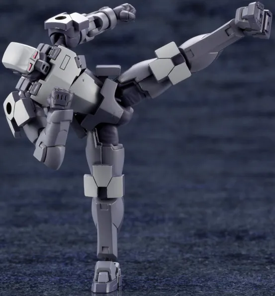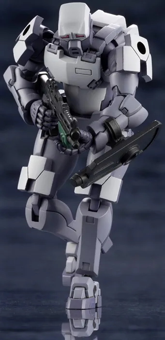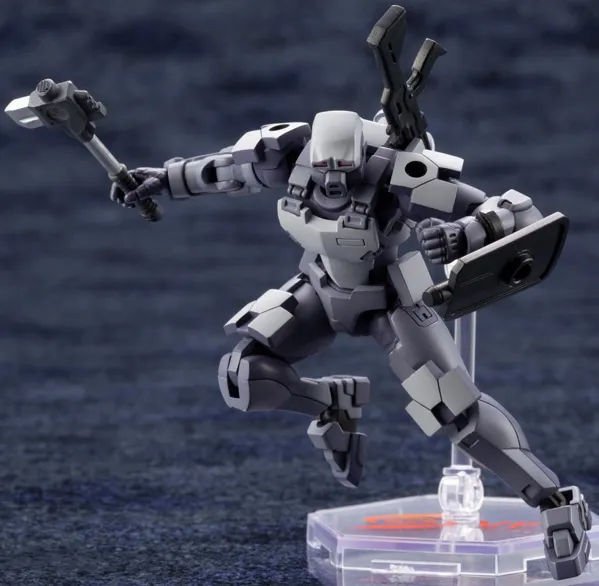 The figure will be about 7.4cm tall when assembled, with 26 points of articulation. The hand weapon can be attached to the backpack, and the 3mm port on the shield means it can carry a wide range of parts such as M.S.G. items. The shoulder hard point is also now 3mm, so you can use Hexa Gear, Frame Arms, and M.S.G. parts with it.