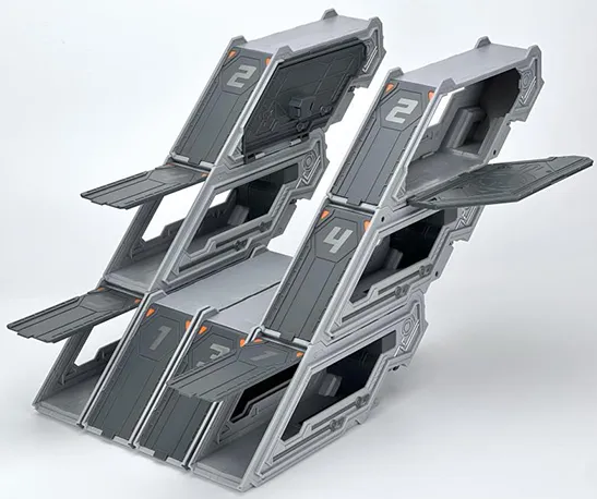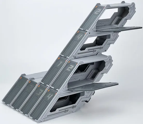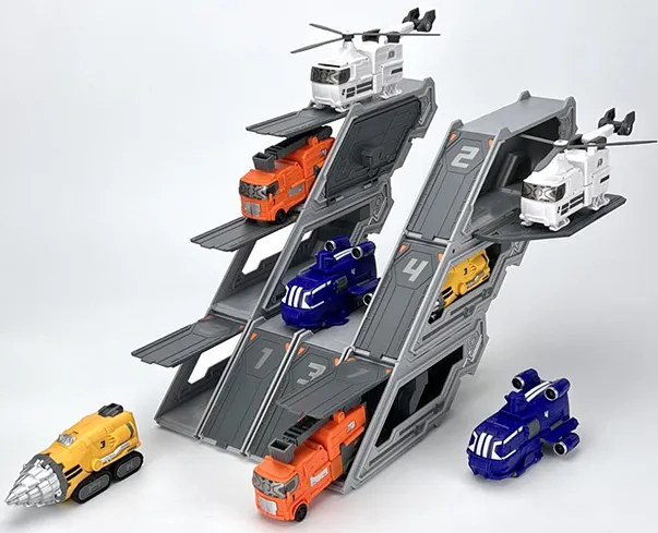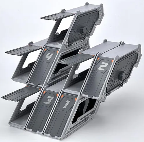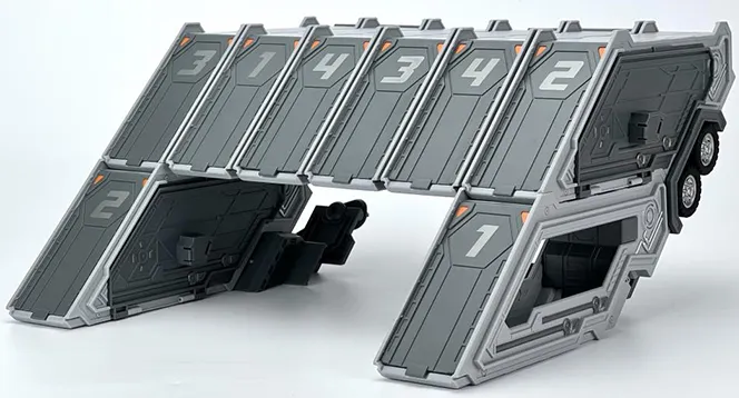 Enhance the playability of the MB-18 Energy Commander with the additional trailer accessories. The modular compartments can be assembled in different configurations and serve as a trailer or a base.