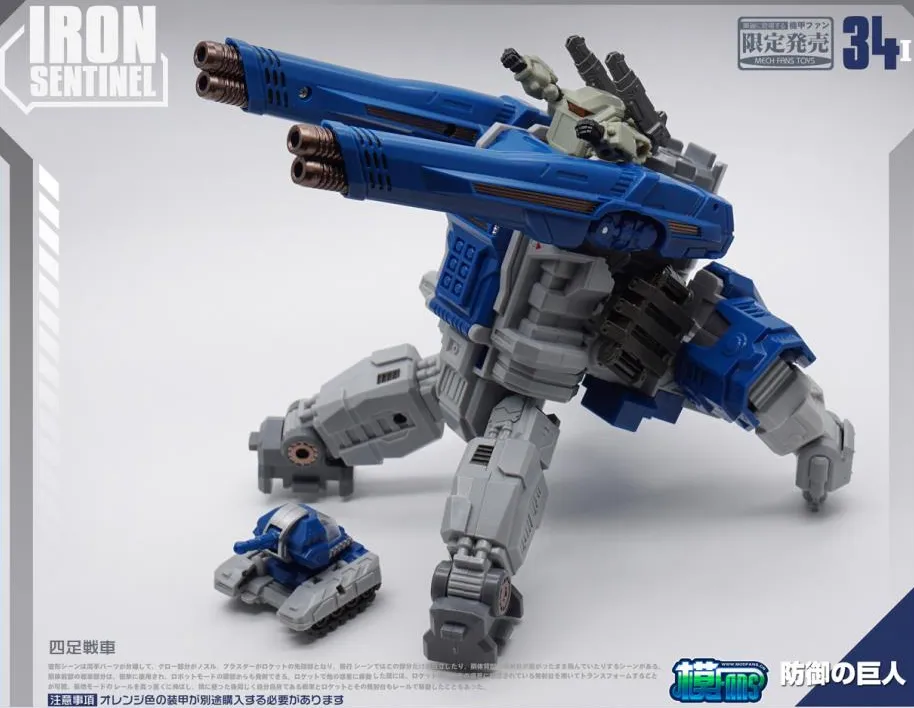 From Mech Fans Toys, this Iron Sentinel figure can transform from robot mode to fortress mode. It features a mini tank that can drive around the fortress on the included tracks!