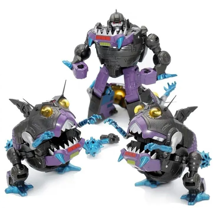 From Mech Fans Toys, the MF-26 Sharktticons Set of 3 figures stand a little over 3 inches tall each, legends scaled, and can transform from robots to sharks and back!