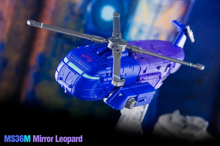 This MS-36M Mirror Leopard figure can convert between three modes; robot, helicopter, and off-road vehicle. When in robot mode, the figure is fully articulated and features a blaster weapon.