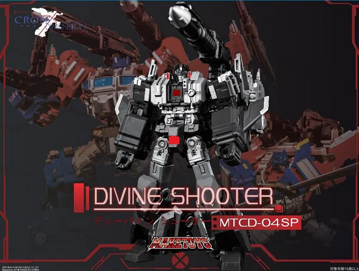 MTCD-04SP Divine Shooter Dark Version stands approximately 7.3-inches tall in robot mode and scales to other figures from Make Toys and to other Cross Dimension Scale figures. Make Toy's figures are fully transformable, offer a high attention to detail, and are made of high quality ABS plastic and some even include die-cast parts.