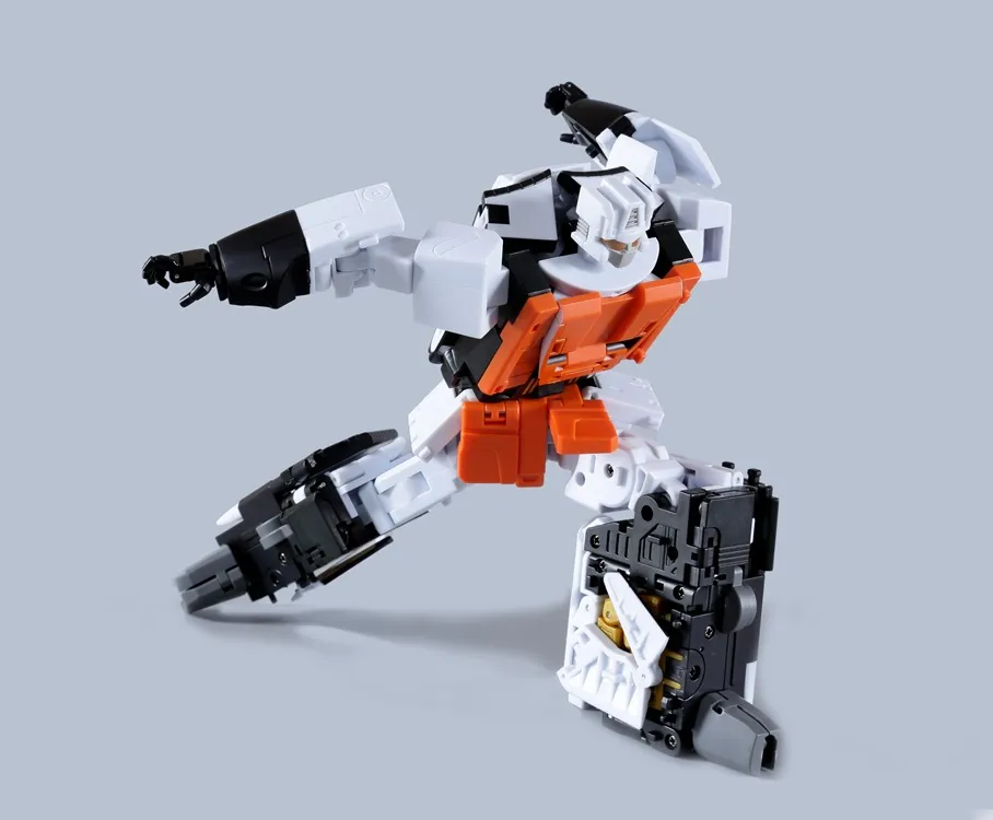 Astrolift converts seamlessly between robot mode, space shuttle mode, and the right arm of Eversus, using only his own components. The combiner arm features a fully functional elbow and wrist, while his handheld weapons store neatly in arm mode for maximum versatility.