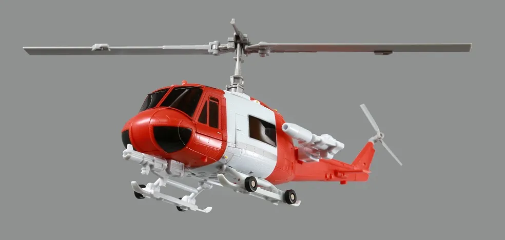 Ventus Alt. transforms seamlessly between robot mode, Huey helicopter mode, and the right arm of Maximus Pro, using only his own components—including a fully functional elbow and wrist. This Alternative Version of Ventus features enhanced paint applications and detailing, bringing extra realism and depth to the vehicle mode.