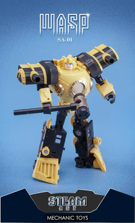 Mechanic Toys presents Steam Age SA-01 Wasp, a steampunk style articulated figure that can transform from robot mode to train mode. SA-01 Wasp features a piece of train tracks and a hammer.