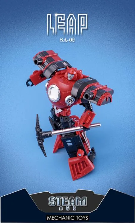 Mechanic Toys presents Steam Age SA-02 Leap, a steampunk style articulated figure that can transform from robot mode to train mode. SA-02 Leap features a piece of train tracks and a hammer.