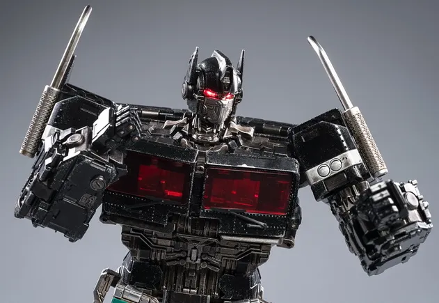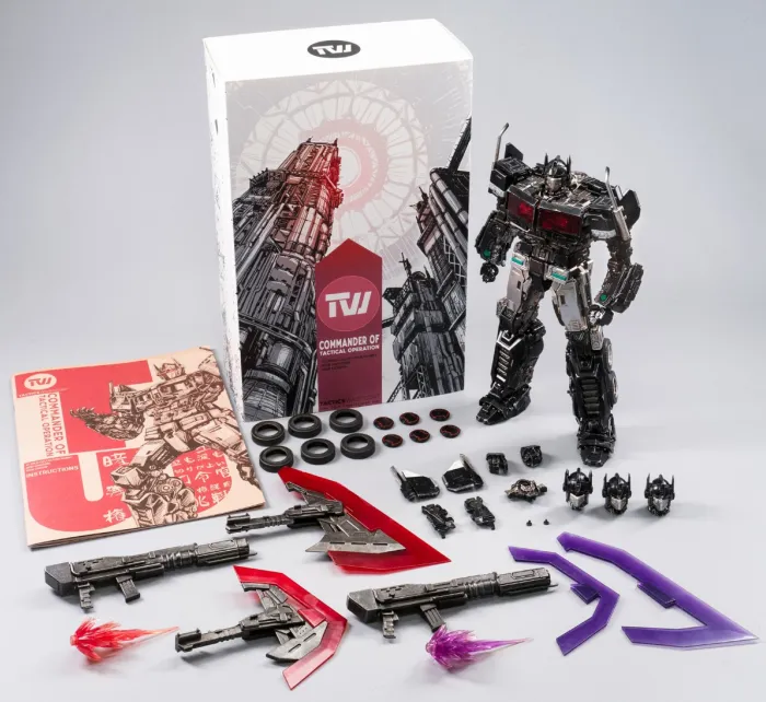 This figure transforms from truck to robot, and it presents its articulated hands and arms.This is a black version of the TW-F09 Freedom Leader, and it includes an array of weapons, effects, and accessories.