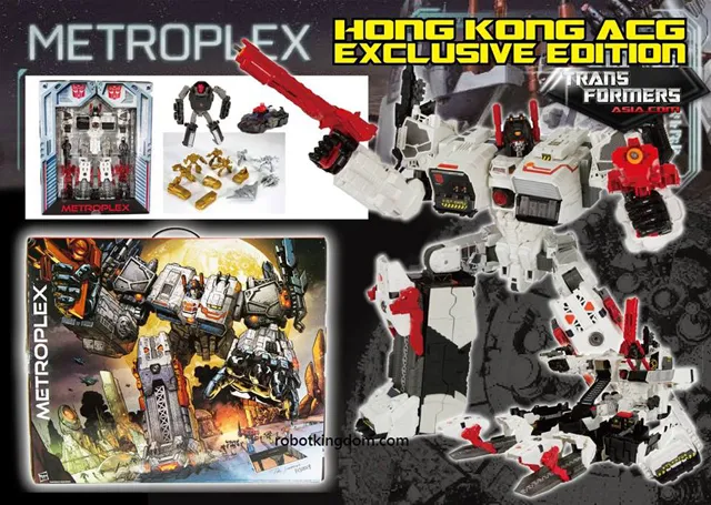 Transformers Generations Titan Metroplex Hong Kong ACG-Con Exclusive is exclusive to the Animation Comic Game Convention held in Hong Kong in 2013. This version of Titan Class Metroplex is almost identical to the SDCC version, except it includes the gold and silver colored decoy figures. Figure features chromed parts and two guns which is an improvement on the original release of Transformers Generations Titan Metroplex.