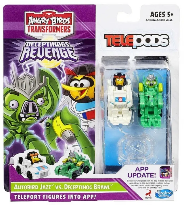 Build - destroy - win! The Angry Birds Transformers toys put you in charge of your own bird-on-pig battles. And what could be better than high-flying birds and villainous pigs re-imagined as Transformers characters? This battlepack pits your Autobird Jazz bird against your Deceptihog Brawl pig, and they can both convert from bird or pig mode to speedy racer mode and back! It's easy to take your games online with the Telepods base, which lets you teleport your bird and pig into the Angry Birds Transformers app. Just put one of them on the base and put the base on your device (sold separately) and scan it into the app. Now you can play as that converting pig or bird! It's going to be total destruction in the battle between your Angry Birds Transformers bird and pig!