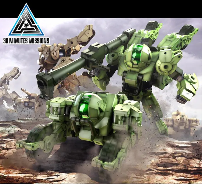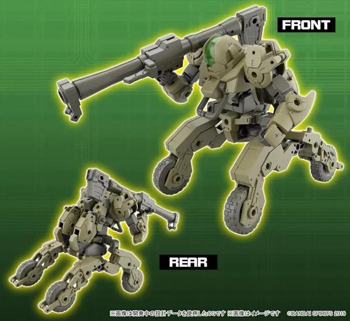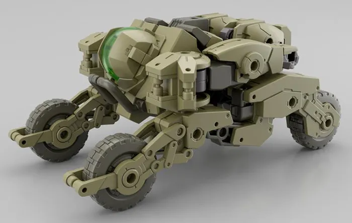 This new aircraft can convert into a 'quad bike' form. The deformation process is equipped with a locking mechanism to stabilize the silhouette after the deformation. Intermediate forms between humanoid and vehicle types can be expressed by customization arrangement. The model kit comes with a bazooka. Customization with existing 30MM aircrafts and optional parts is also possible.