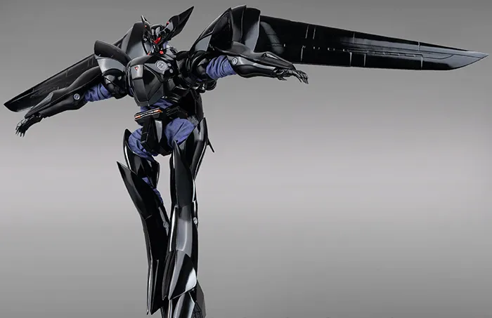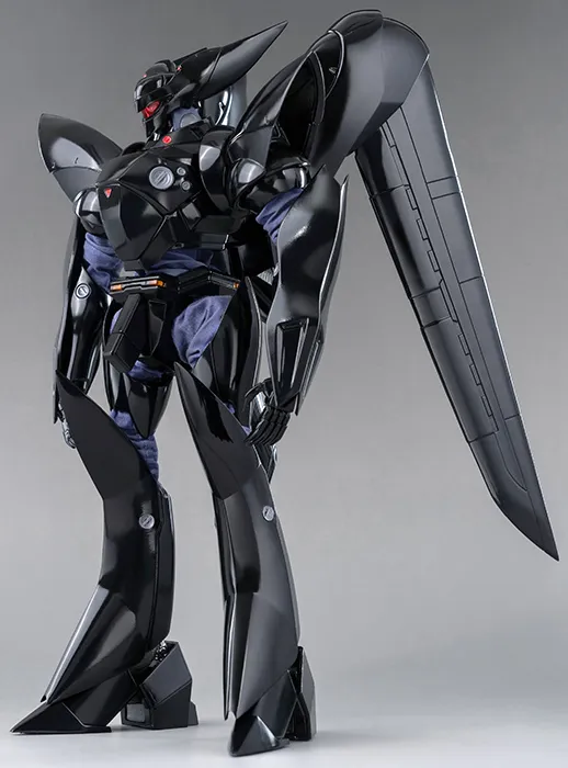 ROBO-DOU Griffon collectible figure includes many interactive features to increase playability. In order to show the cockpit inside, the hatches on the chest and stomach open, and the front of the cockpit can then be detached to reveal the cockpit seat where the unarticulated pilot figurine of Bud Renard Harchand (included) can be placed. The collar and the head of Griffon can also be lifted to reveal the pilot seated inside the cockpit. The iconic large wings of Griffon have 4 points of articulations per wing, providing the wings with various posing possibilities. Even when the wings are spread out in a dynamic pose, the figure retains its balance due to the weight of the zinc alloy die-cast interior frame in the legs.