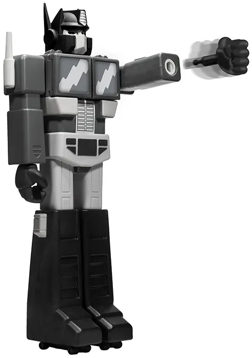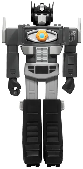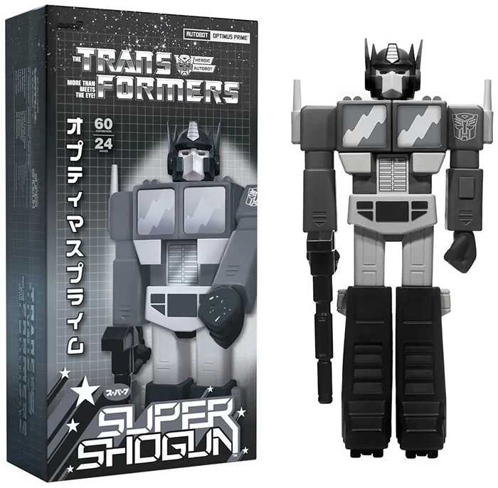 Standing 24-inch tall, the Transformers Super Shogun Fallen Leader Optimus Prime features a grayscale color variant inspired by his tragic death in The Transformers: The Movie.