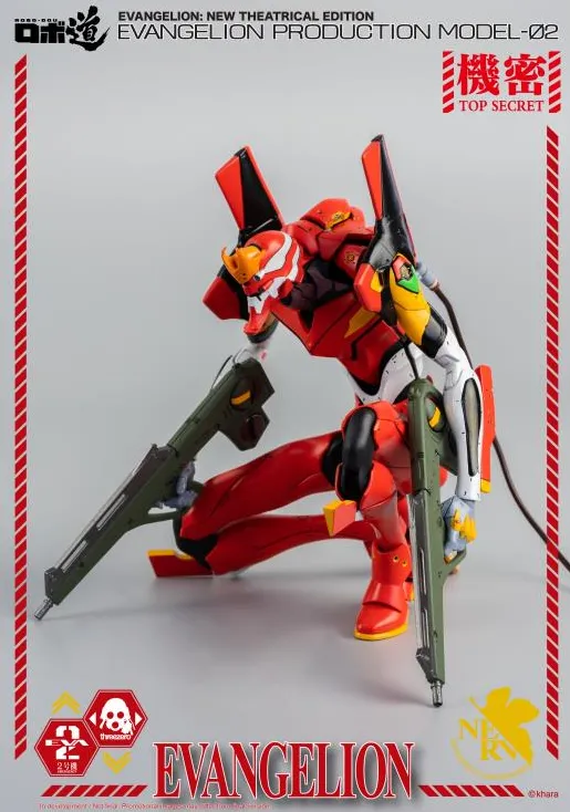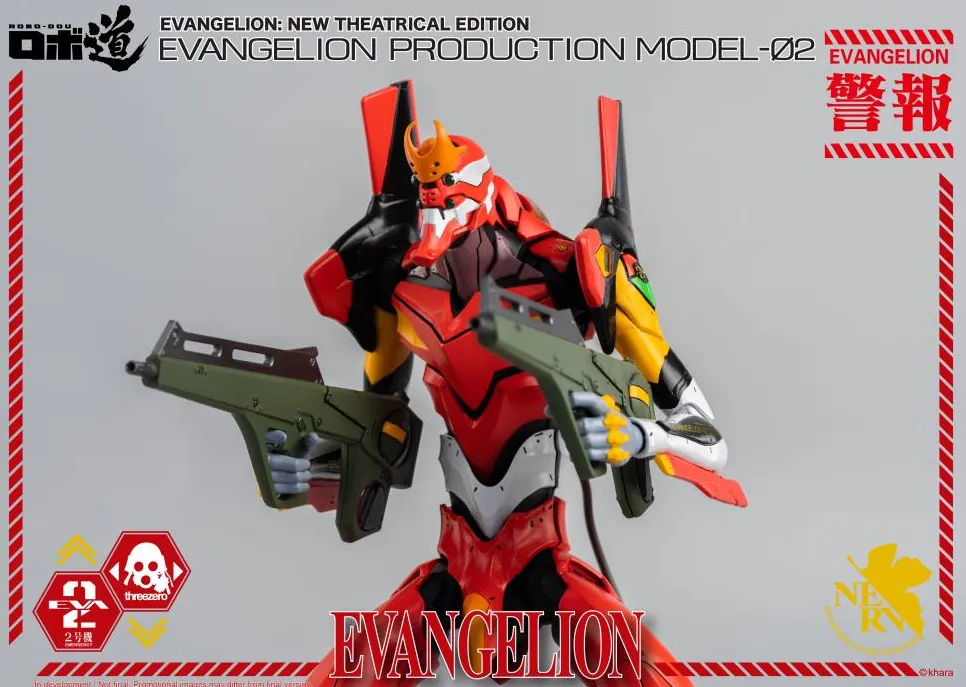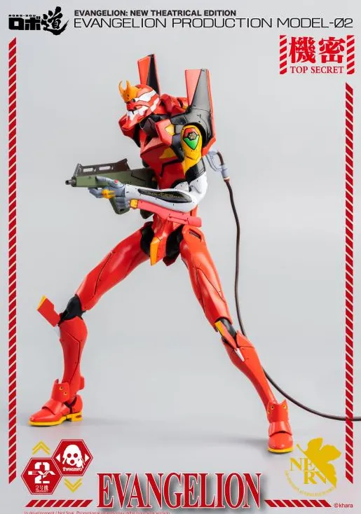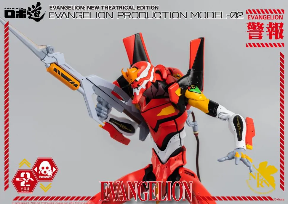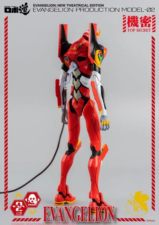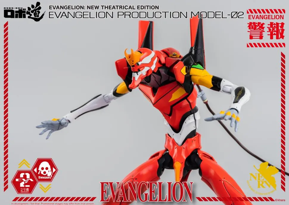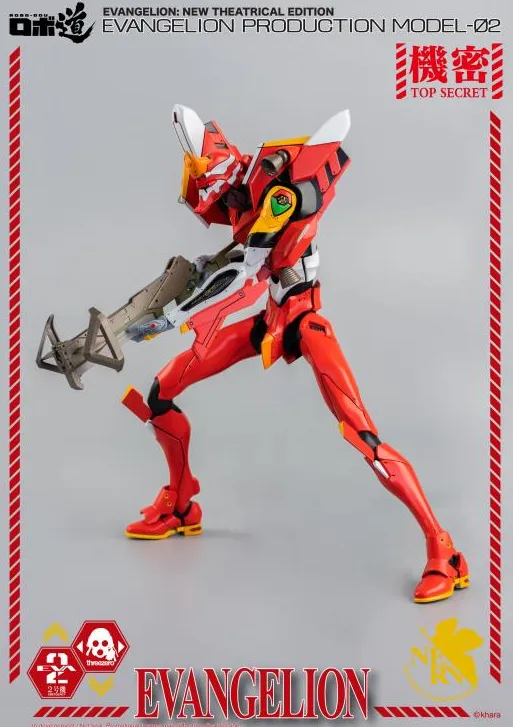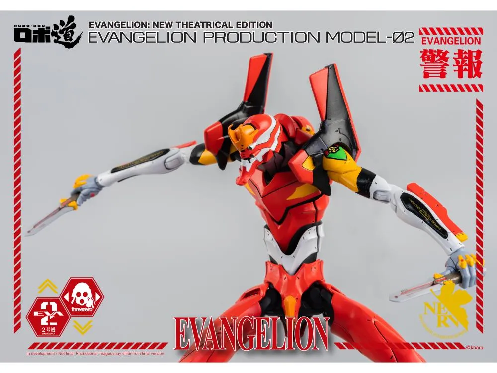 Based on its appearance in the Rebuild of Evangelion films, the ROBO-DOU Evangelion Production Model-02 collectible figure is non-scaled with 48 points of articulation and stands approximately 9.8 inches tall with a remarkable die-cast main frame. The figure is constructed of ABS, PVC, POM, and zinc alloy, and utilizes Threezero's renown paint application technique to highlight all the mechanical details!