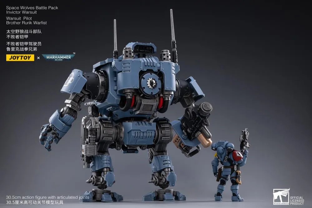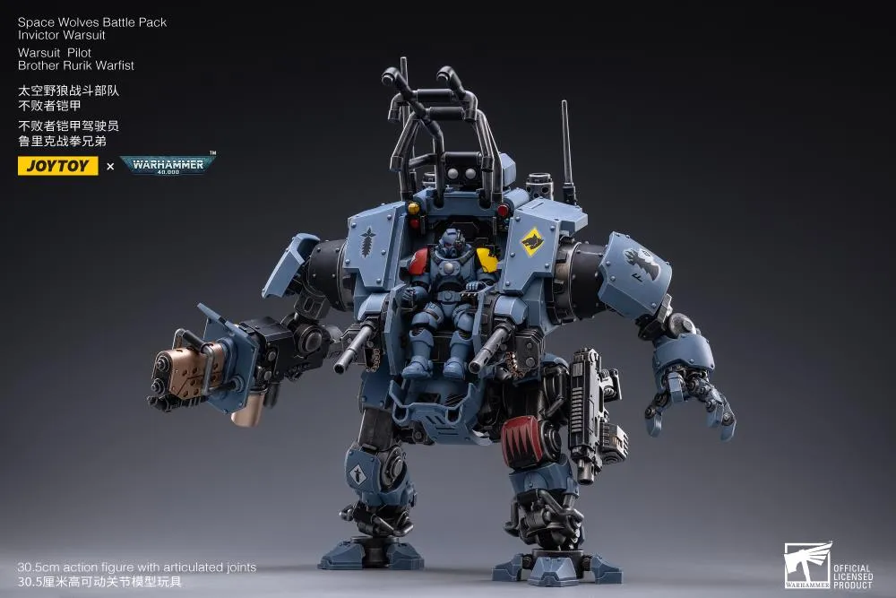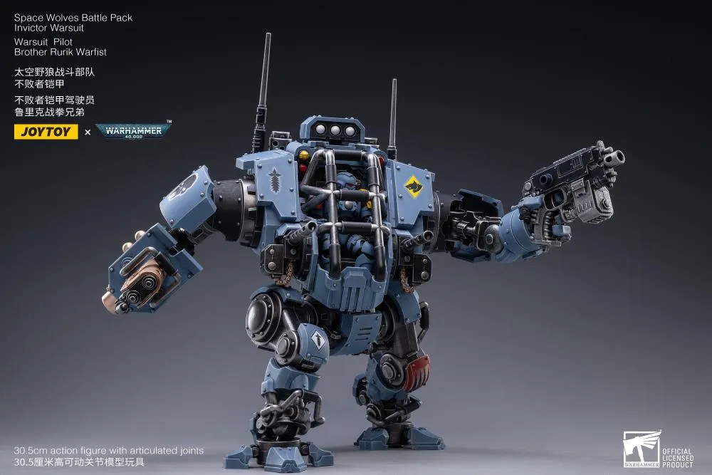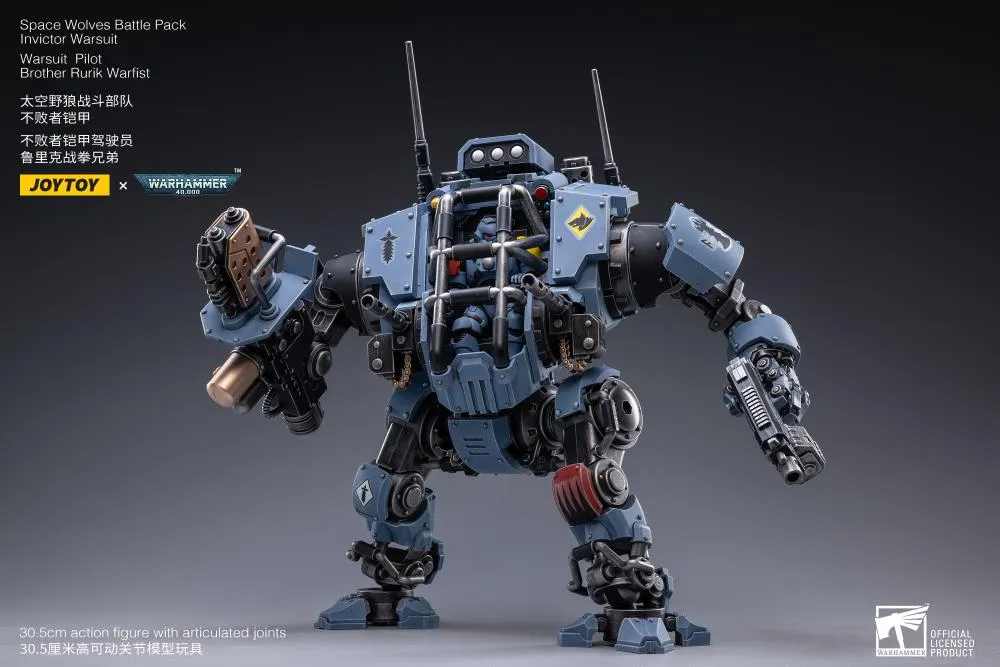 Collect the Space Wolves Invictor Warsuit along with the warsuit pilot Brother Rurik Warfist that can fit inside; each with multiple points of articulation, interchangeable accessories, and weapons for combat.