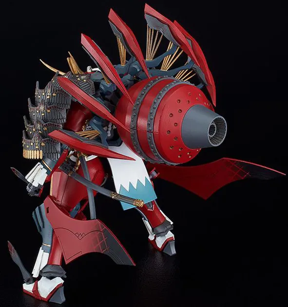 The model stands at approximately 6.3 inches in height. Joints of the model are articulated. Includes wakizashi, tachi, and nodachi swords. The scabbard of the nodachi is articulated. The electromagnetic sword extraction pose can also be created. Create sword-equipped battle-ready poses and flight mode poses alike. Water-slide decals for creating the patterns and characters located across the body are included. The various parts of the mecha have been separated into different colored runners and pre-painted parts, making it easy to recreate the mecha with a simple assembly.