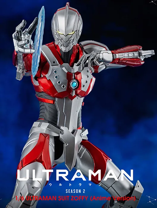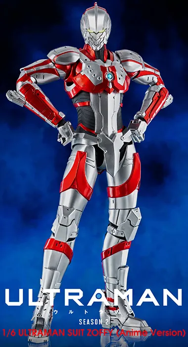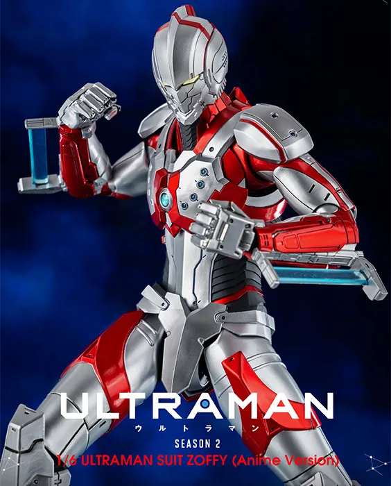 FigZero 1/6 Ultraman Suit Zoffy (Anime Version) stands approximately 12 inches tall, and is a fully-articulated figure with over 40 points of articulation. The collectible has a detailed paint application and decals and is constructed partially of die-cast zinc alloy and other metal parts. LED light-up features are installed at the eyes and the Color Timer on the chest.
