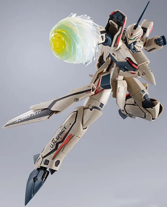This figure transforms into all three of its forms - the Battroid, Fighter and Gerwalk. The characteristic forward wing shape is reproduced when in Fighter mode, and it also has a variable-wing gimmick. The double-seat cockpit can be seen with the opening and closing canopy; three cockpit figures are included: two of Isamu Dyson, and one of Jan Neumann. The landing gear is built in, and a gun pod is included too. The thighs feature a movable axis for active posing, and the movable shaft on the lower leg allows wide opening of the legs when in Gerwalk mode. Three types of interchangeable hands are included, as is a special base that can display the Excalibur in any of its forms.