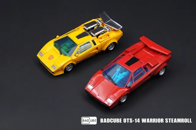 OTS-14 Steamroll is MP scale and sized! Figure stands 20CM/8" in tall in robot mode and transforms into a race car. Equipped with a high-velocity jetpack. If need be, he can switch it over to his leader to help stop enemies at their tracks. Steamroll and his brother are always ready for any challenge. They are inspired by reckless acts of courage. Vehicle mode: Unlike Sunsurge, Steamroll's supercar mode is inspired by a real-lief vehicle, yet still keeping the cartoon quality. It highlights the functional hood, car doors, and headlights. Robot mode: We've redesigned his robot mode to make it more proportional. No more stumpy calf and won't have too wide of a chest. Accessories, -4 types of arm weapons/ accessories/ tools -2facial expressions (total) -Redhot jetpack that fit Steamroll and his leader
