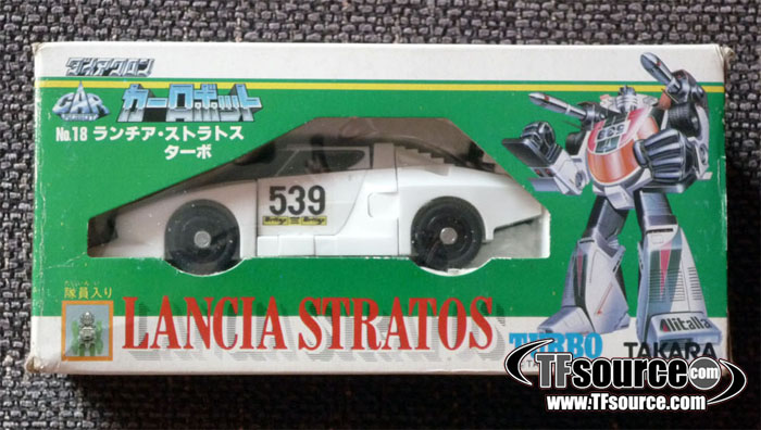 Up next is another Diaclone Car Robot whose mould went on to gain a massive following and widespread adoration as part of the Transformers. The No.18 Alitalla(sic) branded Lancia Stratos Turbo, based on an internationally successful lineage of race cars, would become the Autobot engineer “Wheeljack”. This figure could already have claimed to have the most bizarre robot head sculpt of the entire Diaclone Car Robot family, but its more famous and exotic cousin managed to steal the limelight with its even stranger non-humanoid facial features…