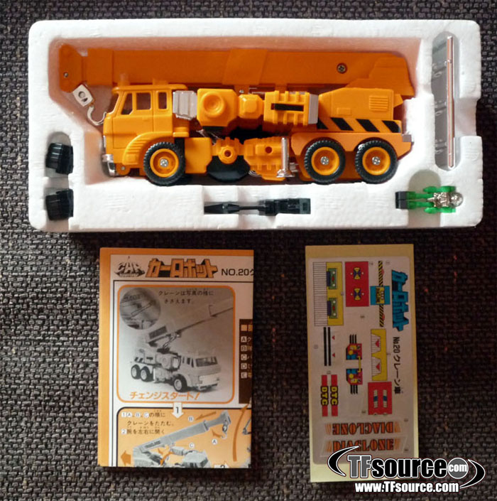 Would you ever believe that this Diaclone version of “Grapple” could be the rarest and hardest to nail of all the Car Robots so far? Whether this is due to the fact that not many were purchased back in the day (tough competition from all those sports cars and Transformers) or that low numbers were produced, in today’s market this item can fetch a hefty sum when Car Robot completists lock horns at auction. The last one hit $3450, stickers applied! Personally, I’m still of the opinion that the black No.9 Honda City Turbo is a more difficult item to locate, but this No.20 Truck Crane is either its equal or a close second. It also has a very nice Diaclone-themed stickersheet and the “FUSO” plus Mitsubishi moulding on the truck cab, not to mention very attractive outer packaging.