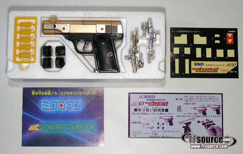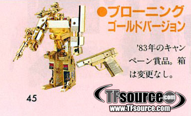 One variant you will not see for sale too often in your collecting lifetime is the Japanese Micro Change campaign prize Browning, drenched in shiny gold chrome from head to toe. If you are lucky enough to ever see one in person, you’ll never get over its beauty. For now, here’s a scan from the Takara Science Fiction Land book: