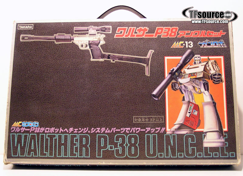 From the glorious MC-13 Walther P38 U.N.C.L.E. Gun Robo set, that’s where. This final Micro Change Gun Robo came packaged in a beautiful box made to resemble a leather suitcase with handle. The robot artwork should be familiar to us all, pre-Megatron in all his glory. The rear of the box shows how all the extra pieces can attach to the robot in both modes, even depicting its compatibility with Microman figures. That should answer any lingering questions anyone may have regarding the original alternative purpose of all those bits and pieces that came with Megatron.