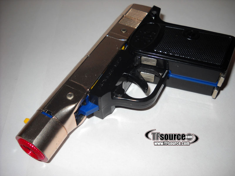 First on our list is the MC-07 M1910 Gun Robo Browning, based on Fabrique Nationale’s 1910 handgun designed by John Browning. If you’ve never seen this one in person and you have become used to the size and weight of the Transformers Megatron Walther P38 model, you’re in for something of a surprise because the MC-07 Browning is relatively small in weapon mode. This quite excellent toy comes in dark smokey chrome with red highlights, but also a more light shiny metal (gold-tinted) variant with blue highlights.