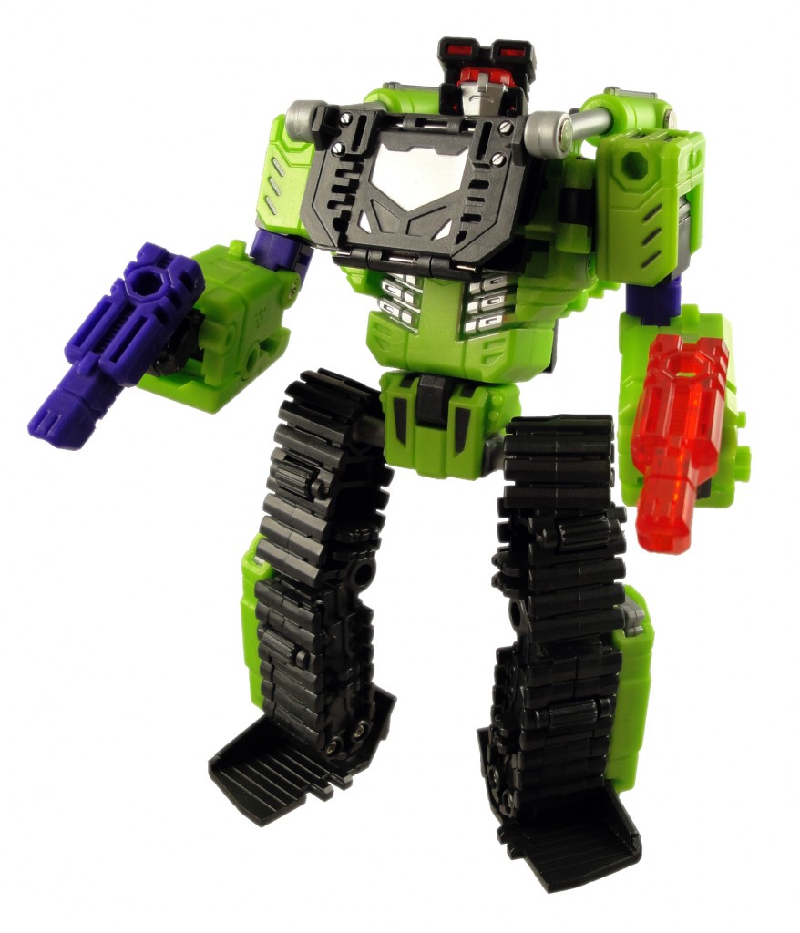 About the best way to see how to transform Neckbreaker between his bulldozer and robot modes is to watch the TFSource video review at YouTube. The toy’s not complicated to transform, but I found the review helpful while transforming the arms into the engine/hood section of the vehicle. What I like most about the toy’s transformation is how it’s not overly-complicated; some Transformers are annoying to transform because there’s zero tolerance for positioning the parts during the transformation. Neckbreaker is not that fiddly or annoying.