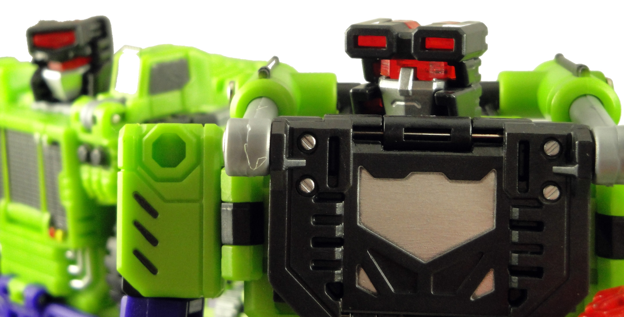 A really nice sculpted detail on Neckbreaker (as well as other toys in the line) is the depressed area on the front of the chest that’s just begging me to add a Decepticon symbol to the toy. The shape and size is basically perfect and it shows that TFC Toys really did think through a lot of the details as they were designing this series of green and purple construction vehicles.
