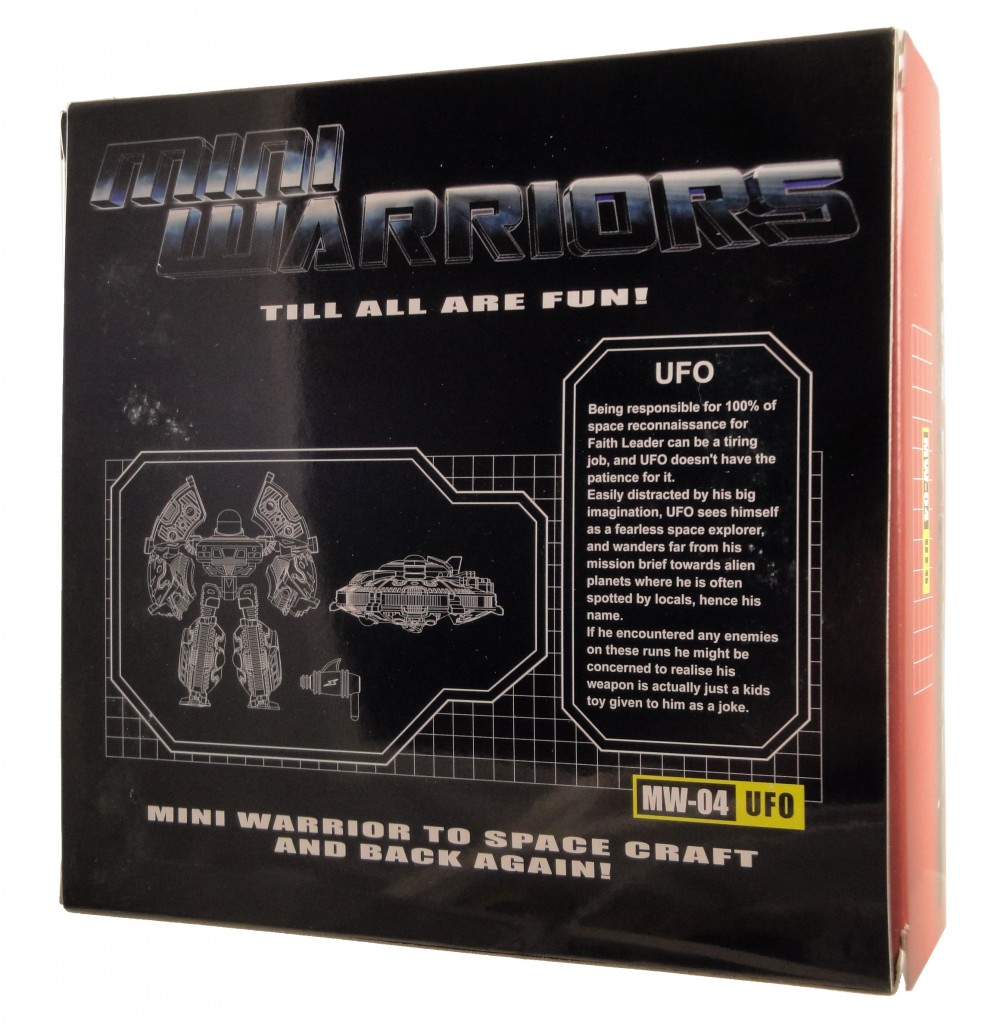 iGear’s Mini-Warrior UFO (available now at TFSource) is another great entry in what is turning out to be fantastic series of transforming robot toys. Released at the same time as Hench (who I already reviewed at battlegrip.com) my only complaint with both of these toys is that they’re so very neat that I want the next releases in the series right now. I have to wait? That’s so unfair!