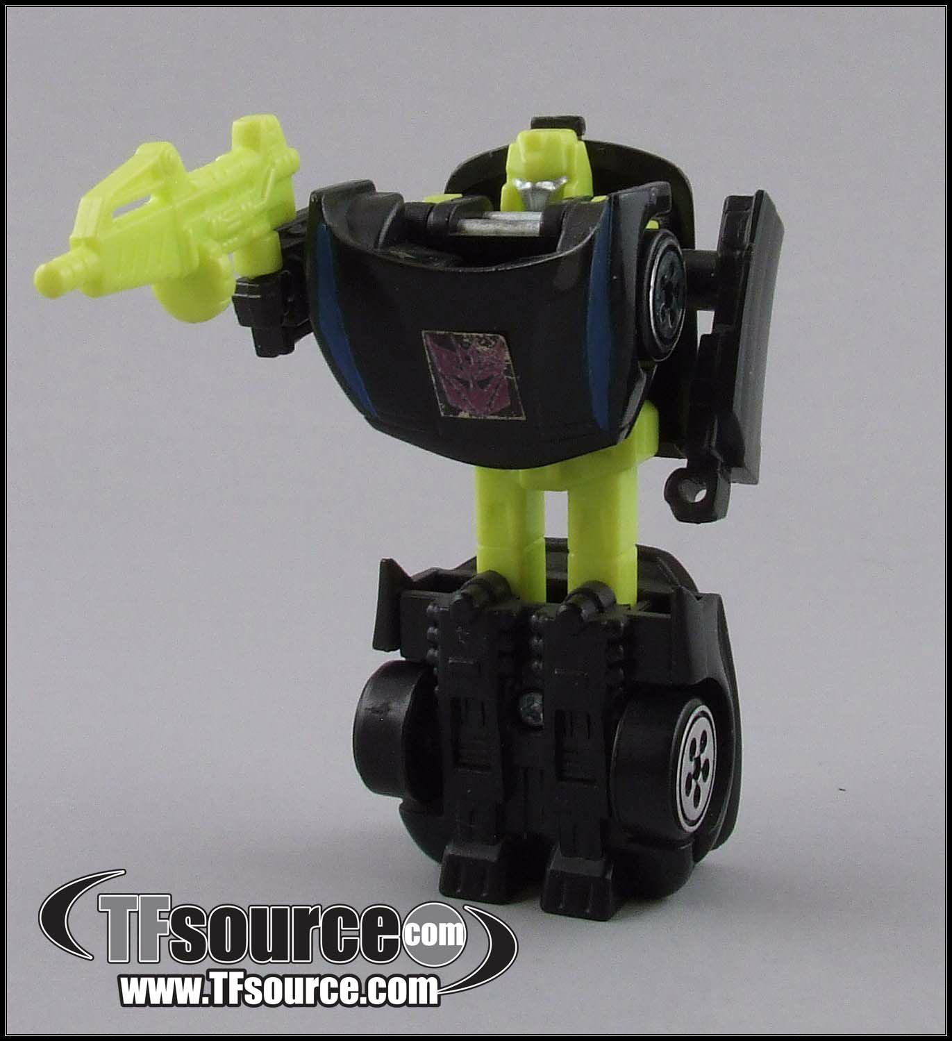 With added paint and the Decepticon sticker, the convention exclusive was completed! Approximately 294-298 figures were produced with an estimated 216 figures sold at the convention to its pre-registrants only (walk ins were not offered the figure for sale). Some of the remaining stock was supposedly sold at a later point through WhizBang Toys, although this batch did not have the BotCon customizing on it.