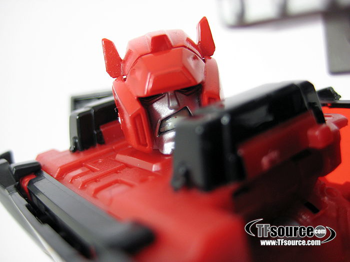 As more news and images emerged about G2 Sideswipe, it became obvious that this was not a straight black and red repaint of a surely-decaying mould, for a start it was very obviously based on the Derek Yaniger-drawn G2 Sideswipe from Marvel’s Transformers Generation 2 series written by Simon Furman. A Sideswipe armed to the teeth, showing teeth and completely unmistakable.