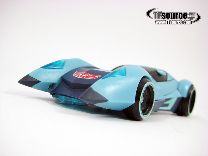 One of my first discoveries was just how highly regarded the deluxe Blurr figure was amongst collectors. In the segment that Dan Ghile and Richard Brown did for the Ambassadors series of TFSource Blog articles, they chose Prowl as the perfect representative for Animated, but very nearly opted for Blurr. Upon handling recently, I was left quite speechless at what the designers had achieved in terms of enjoyable transformation married to show accuracy, and a height of sleekness in both modes reached only by Classics Mirage in recent times. Hollow wheels, HOLLOW WHEELS, and just get a load of that running pose his tiny little feet can support without any Photoshop trickery. His flip-out weapon is a little naff, but the shield is totally Blurr, the tabbing in car mode can be tiresome but this is a sublime toy oozing poses and personality.