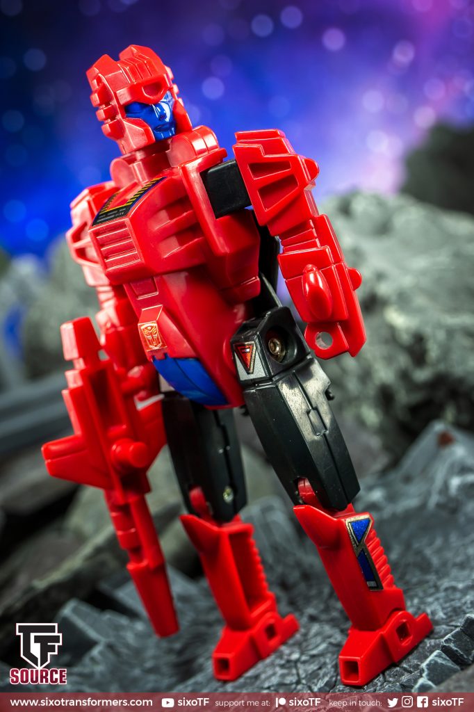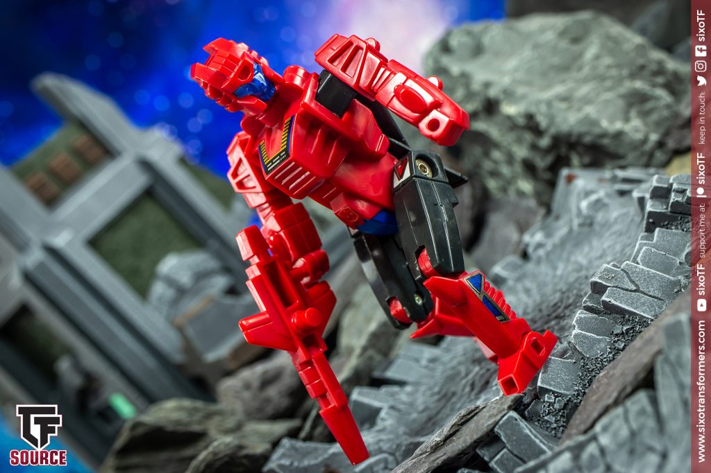 I also love that headsculpt, with the dark blue face proving very striking against the vibrant red body on the whole. My copy is again wearing the Toyhax labels on the inner robot, which I maintain do wonders for making the colours sing.