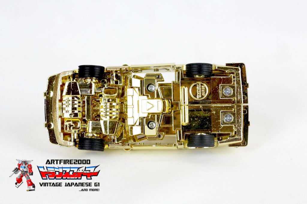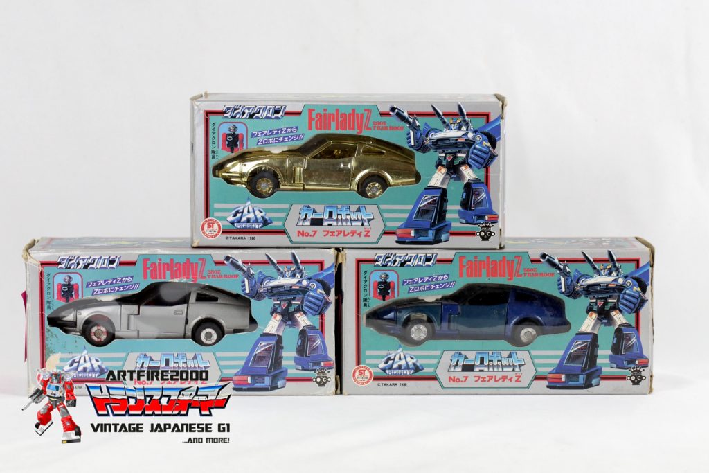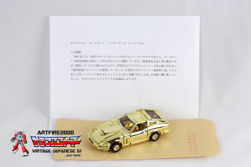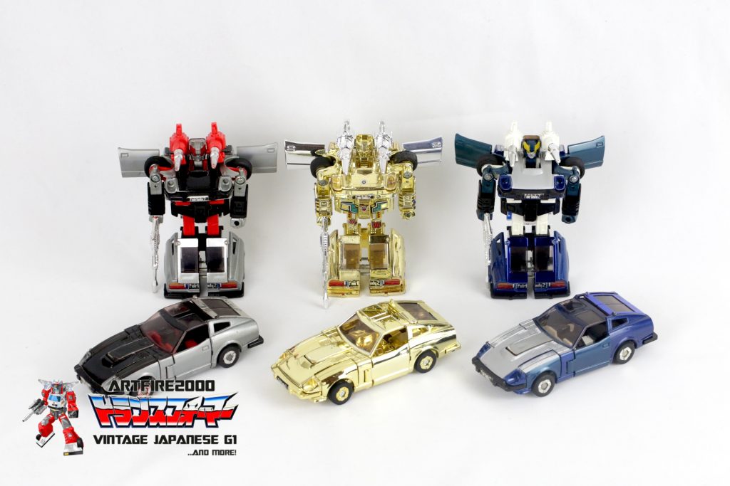 To date, no photos or concrete evidence of the silver chromed version of the Datsun Fairlady Z have ever surfaced. No silver-chromed version has ever been seen in the Western or Japanese open market. It should be noted that the authors of the Takara-endorsed books may have had access to documentation suggesting it exists. It is also possible that Japanese collectors, oftentimes secretive, may have privately seen some evidence of its existence. It is interesting to note that Takara itself, if they have a hard copy of the silver one, has never displayed it despite showing the gold version at events like TF Expo. Informed speculation at this point suggests that the silver-chromed version may not exist. We can, however, tally on one hand the number of gold-chromed versions known to exist: