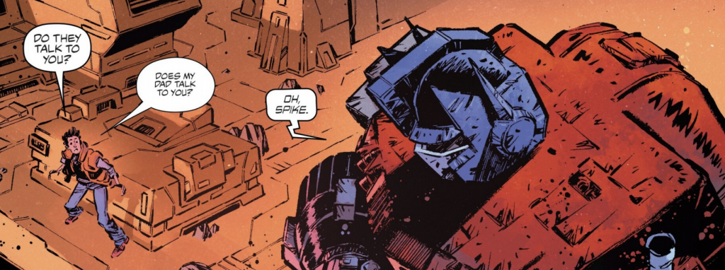 Next, we catch up with events on Cybertron during a brief conversation between Cliffjumper and Shredhead. The newly created Autobot explains that although they have a hazy memory of Cliff from their previous existence, it’s not distinct enough to make sense of, yet they know they are forever connected. They also have a chat about Carly, whom Cliff is concerned for (although he cannot surely know that she has been taken captive at this point, so perhaps it’s just bad vibes on his part?). He explains to Shredhead that it was Carly who painted the side of their van mode, and before you know it, it seems they’re suddenly keen to help her, too! We’ll have to wait till next time to see how this plays out, but it will be intriguing to see the Skybound original character amongst the Earthbound Autobots.