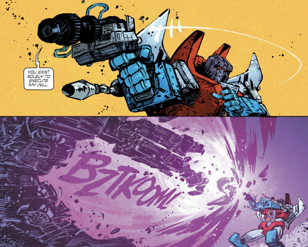 Firstly, Megatron proceeds to kick the living snot out of Starscream, seemingly having brought him back to full operation purely to beat him down all over again as a twisted means of punishment! This kind of physical retribution between these two characters is nothing we haven’t seen before in Transformers media, although here, it’s distinctly more brutal than the norm! However, it’s what comes next that is particularly harrowing, as Megatron then orders Astrotrain to be brought out before transforming to his gun mode and forcing Starscream to fire on his former comrade as a means of execution. Despite his protests, it seems the Seeker is powerless against his master’s mind-controlling influence, just as we’ve seen in #13 and #19 last time. However, with Megatron missing his arm (we’re not sure why he can’t use that snazzy chair to heal himself, but whatever – let’s just say he can’t!), it appears he’s not quite as full power and Astrotrain still clings to life, meaning Starscream must fire repeatedly in order to finish the deed. With the triple changer now dead, it leaves us wondering if we will ever find out the identity of his ‘love’ after all, whilst Megatron prepares to launch an assault on the Autobots and reclaim his stolen appendage.