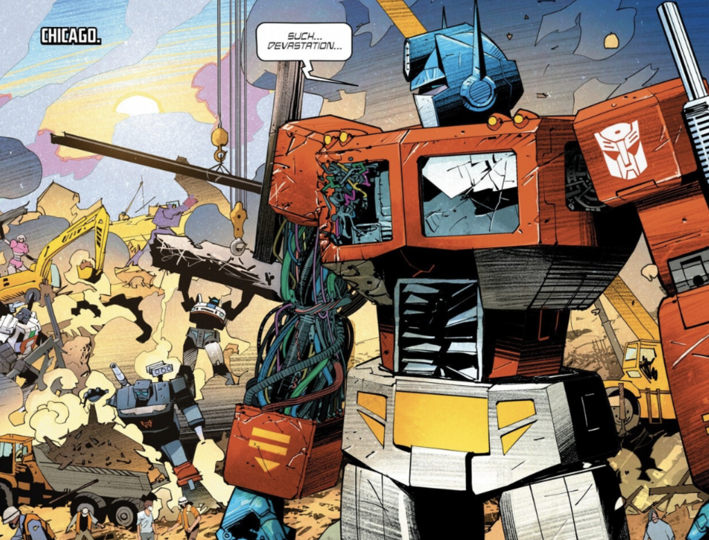 So much of Skybound’s Transformers is clearly inspired by the original 1980s cartoon, and that’s overtly obvious here with a page-turn Decepticon to Autobot symbol flip to usher in the book’s new era (and new artist!) proper. No doubt many readers will have heard the classic theme in their head as it happened! In any case, the good guys are here, as we check in with Optimus Prime and crew whilst they pick up the pieces from last issue’s city-levelling antics. Much has been rightly made of having a penciller like Dan Mora on board a Transformers book. However, it’s fair to say the art is undoubtedly an adjustment from the more ‘craggy’ work we’ve become accustomed to! Those are some *straight* lines, with everything presented in an ultra-defined, clean style. A few of the characters certainly look a little different, too (Jazz has door wings now!). Still, from someone who grew up with the week-to-week artist rotation of Marvel UK Transformers, it’s hardly jarring. More than that – it looks gorgeous!