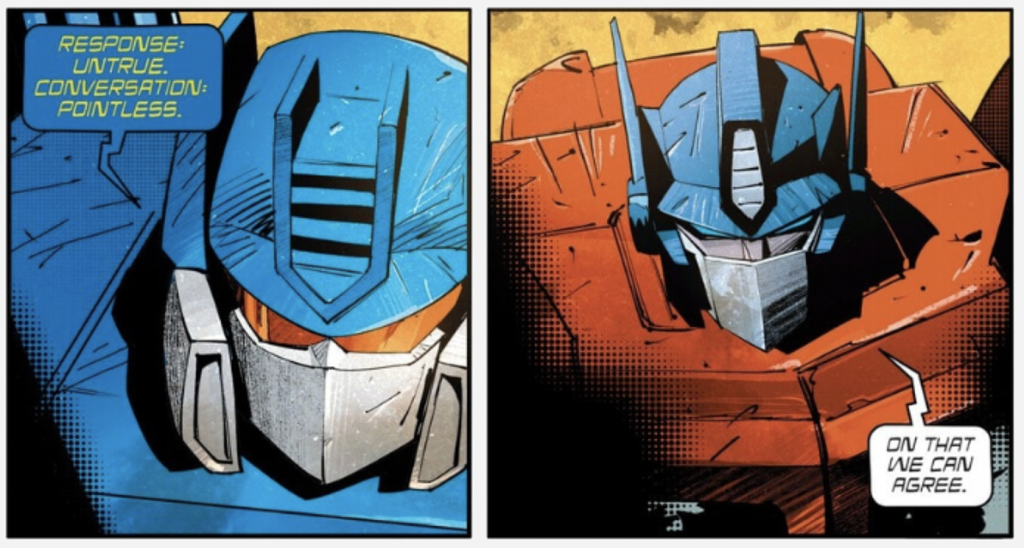 Just as we took stock of the Decepticon ranks in the prologue, so too do we spend a bit of time with the assembled Autobots here as they clean up the city, and there are several things to note. Firstly, some of the characterisation picks up immediately from where the previous arc left off, with Ultra Magnus continuing to beat himself up, this time lamenting that he should have done more to prevent the Decepticon destruction. However, what’s also notable is which of the cast are present for this scene – and which aren’t! Firstly, I was surprised to see Beachcomber up and so merrily taking part in the repair work, given the last time we saw him in #24, he was looking somewhat worse for wear after being presumed dead in #23. Equally, there’s still no sign of the Aerialbots, who haven’t been seen at all for two issues now. Likewise, where is Shreadhead in all of this? It’s a genuine surprise to see them being absent from #25, especially as it feels like an obvious starting point to begin padding out their character a bit. Similarly, both Spike and Carly fail to put in an appearance, too, so perhaps we’ll see more of them and Shreadhead next time.