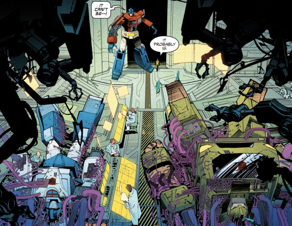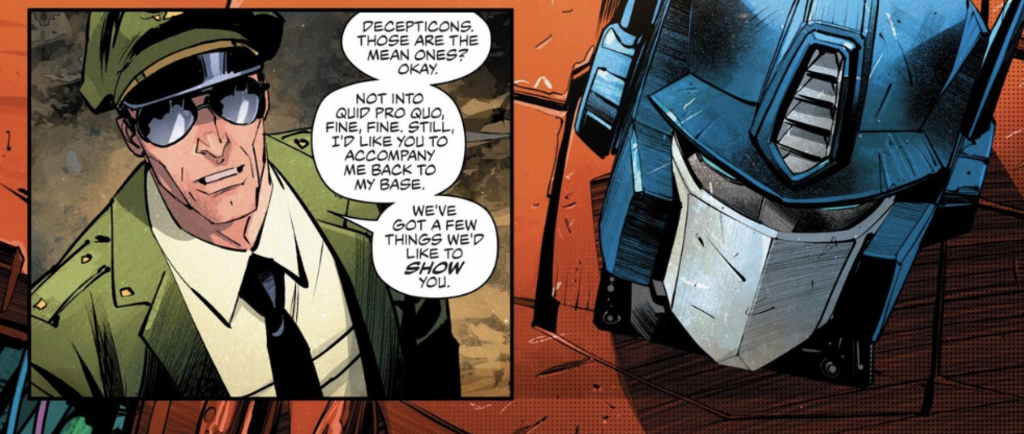 As Flagg takes Prime on a tour of the depths of the humans’ military base, he is led to a large room containing the comatose bodies of two of his old comrades, Mirage and Bulkhead! Flagg explains they were discovered in 1906 and 1936, respectively, and that studying them has helped advance the Earth’s native technology. In some ways, this echoes a similar idea seen in the 2007 Transformers film, with Megatron having been on ice in a human laboratory for many years. Here, though, it seems the military has also built up a huge cache of energon and is all too willing to hand it over to the Autobots in exchange for their help in defeating the Decepticons! We knew that Bulkhead would be making an appearance in this book soon, thanks to some design art posted on Skybound’s social media. Still, it will be intriguing to see how these new characters are properly worked into the storyline, especially as the big green guy promises to take us beyond the classic G1 horizons of the first 24 issues.